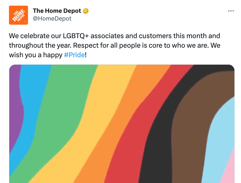 Last June, Home Depot tweeted, “We celebrate our LGBTQ+ associates and customers this month and throughout the year. Respect for all people is core to who we are. We wish you a happy #Pride!”