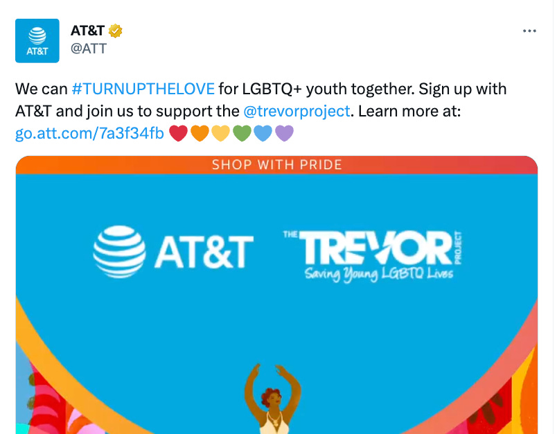 AT&T’s website states that it is “committed to standing behind the LBGTQ+ community” and that it “support[s] organizations and projects that strengthen the LGBTQ+ community.” In 2021, AT&T tweeted, “We can #TURNUPTHELOVE for LGBTQ+ youth together.”