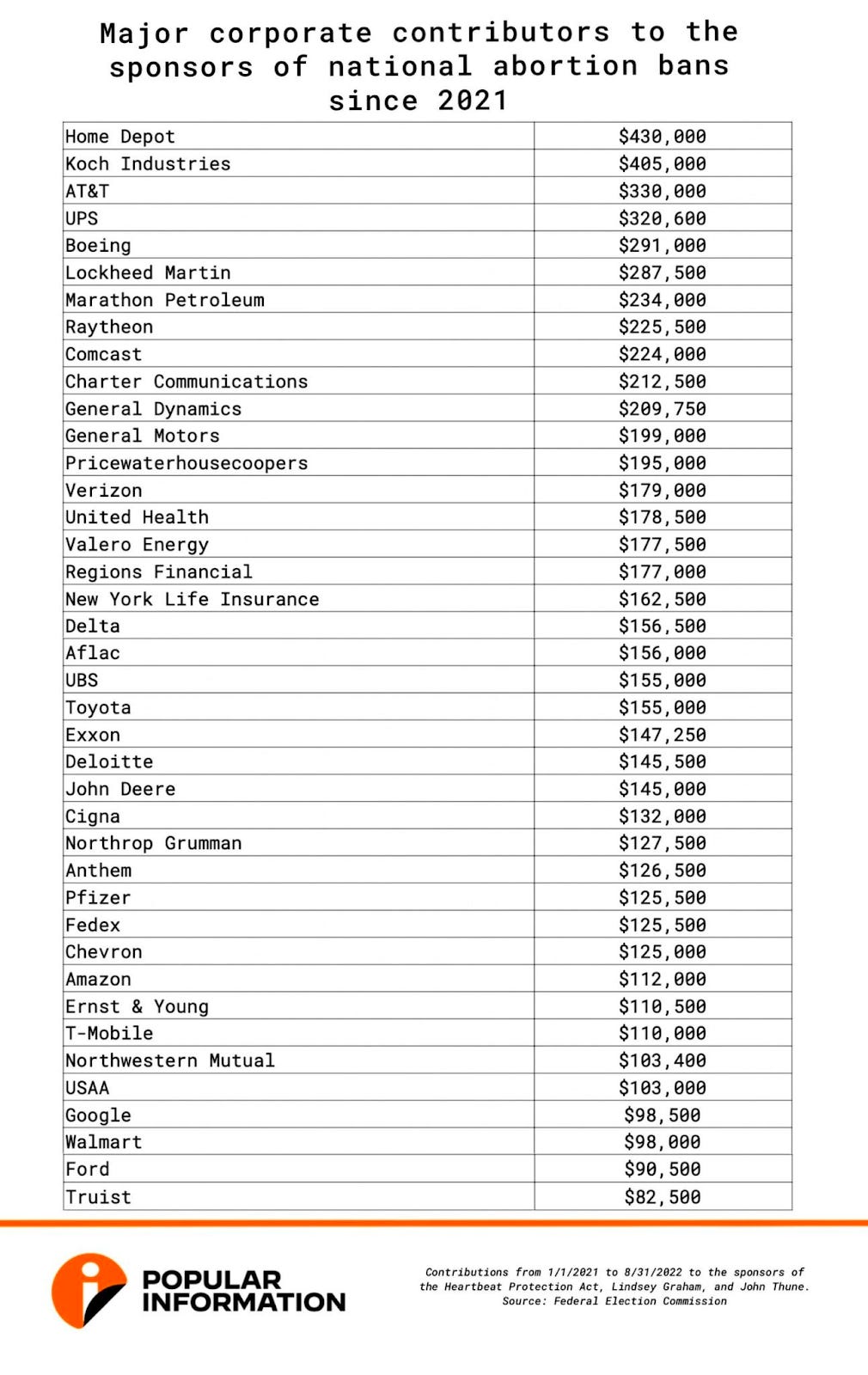 Other major companies that have pledged to cover costs for abortion-related travel while also contributing thousands to the legislators behind proposed national abortion bans include Deloitte ($145,500), Amazon ($112,000), Walmart ($98,000), and Ford ($90,500).