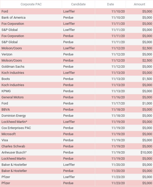 ^Anheuser Busch donated $5,000 to Perdue's run-off account and $5,000 to Perdue's recount account. (There has been no recount of the Senate race.)