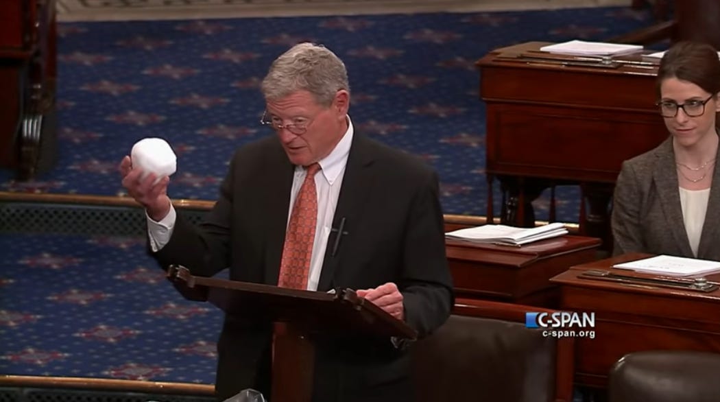In February 2015, Inhofe appeared on the Senate floor with a snowball, claiming it was proof that global warming was fake.