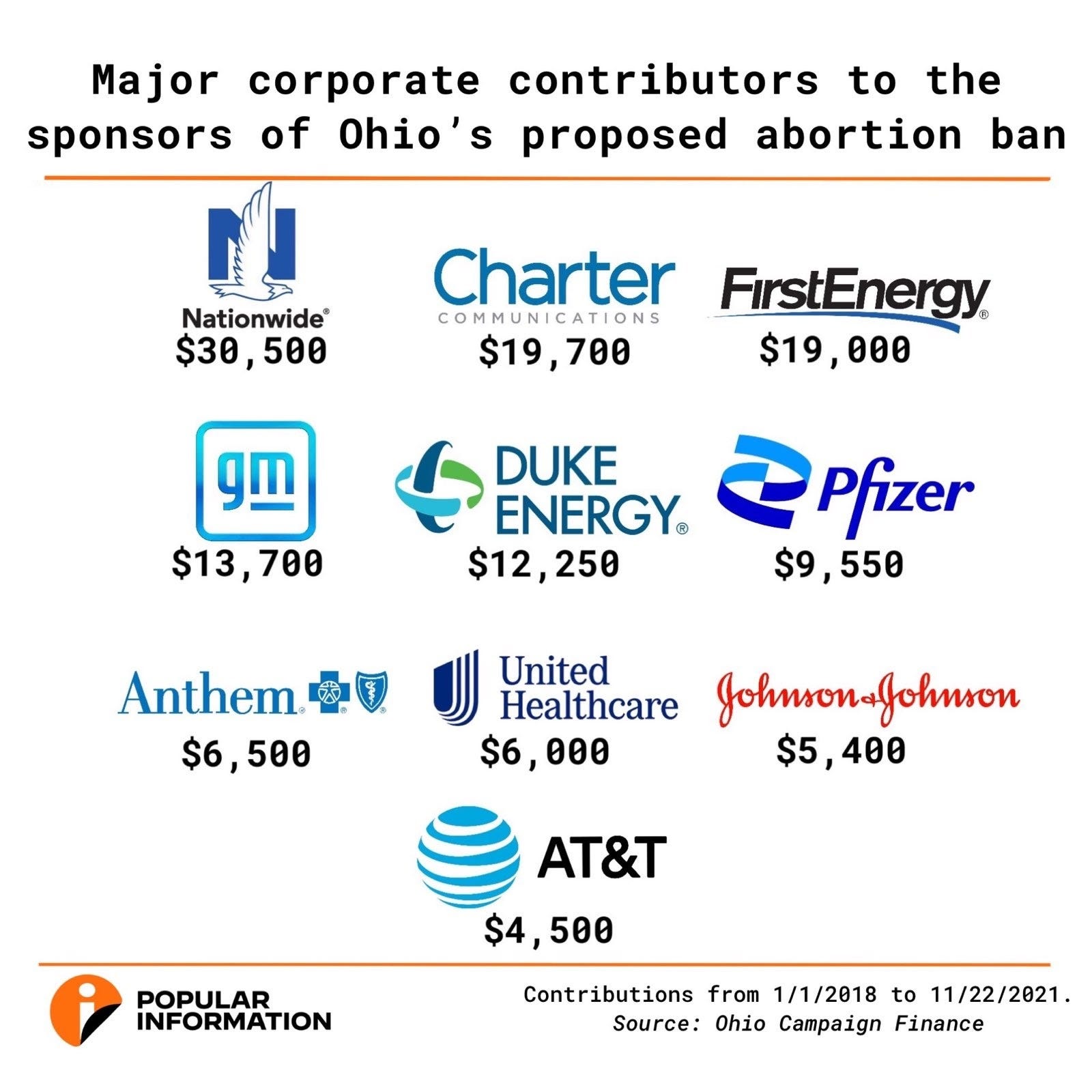 Other top corporate contributors to the co-sponsors of Ohio's proposed abortion ban include Charter Communications ($19,700), FirstEnergy ($19,000), GM ($13,700), Duke Energy ($12,250), and AT&T ($4,500).