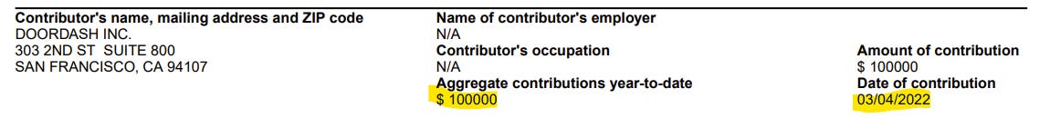 On March 3, 2022, DoorDash donated $100,000 from its corporate treasury to the RGA.