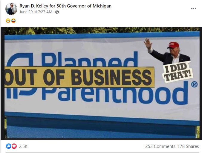 The leading Republican gubernatorial candidate, real estate investor Ryan Kelley, says he supports the 1931 law. "I do believe that there are no exceptions for abortion except for the life of the mother," Kelley said. (Kelly has been criminally charged for his involvement in the Capitol riot on January 6.)