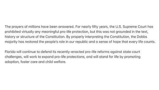 In Florida, a new law bans abortion after 15 weeks. (The law, which was scheduled to go into effect on July 1, has been temporarily stayed by a state judge.) But Governor Ron DeSantis (R), who is running for reelection, says he "will work to expand pro-life protections" now that Roe v. Wade has been overturned.