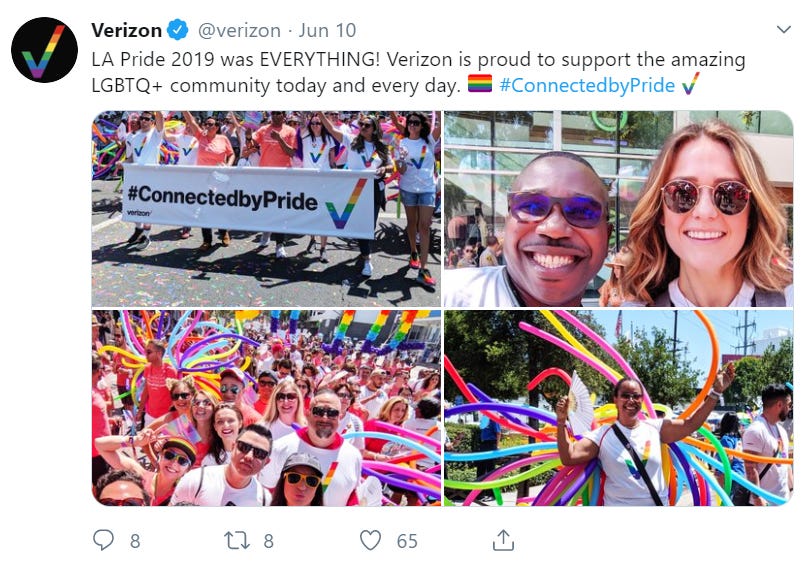 Verizon says it "demonstrate[s] leadership by reinforcing its commitment to policies important to the LGBTQ community."