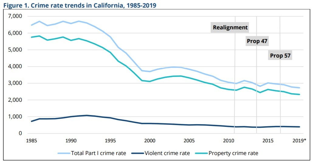 The criminal justice reforms enacted in California over the last ten years have coincided with a decrease in Part 1 crimes (homicide, rape, robbery, aggravated assault, burglary, larceny-theft, motor vehicle theft, and arson) and property crimes. Overall, crime remains at historic lows across the state.
