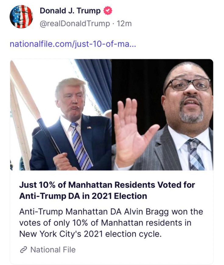 Later that day, Trump posted a photo of himself holding a baseball bat next to Bragg's head.