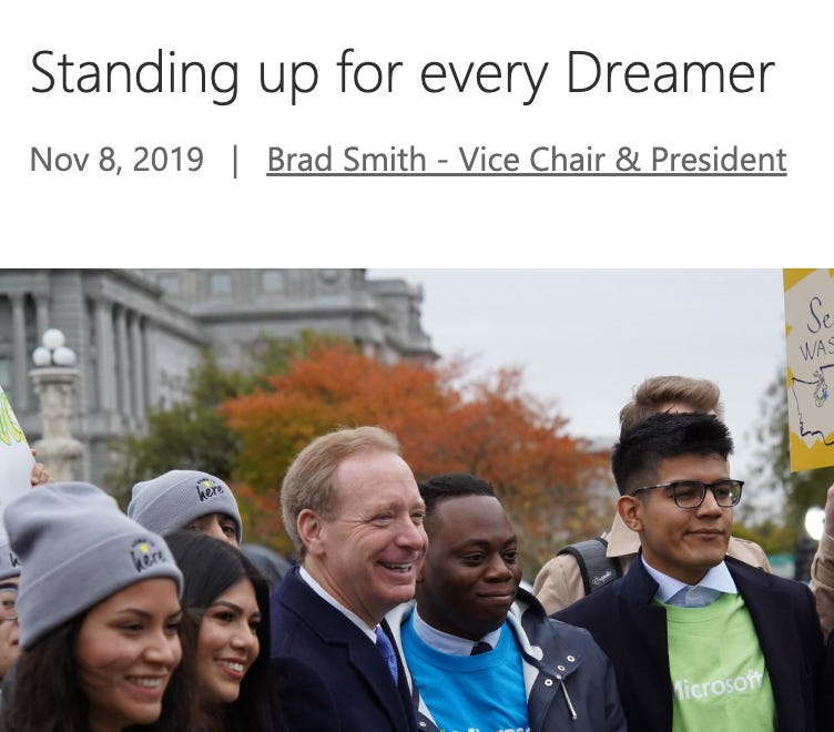In 2019, for example, Microsoft President Brad Smith published a statement on the company’s website titled, "Standing up for every Dreamer."