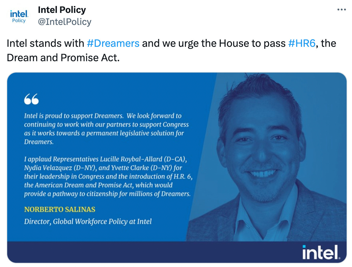 On its website, Intel writes that it supports “meaningful immigration reform” that “provide[s] a legislative solution that leads to DACA beneficiaries qualifying as U.S. workers and having a pathway to becoming lawful permanent residents.” The company called on Congress to pass the Dream and Promise Act in 2021 and is a member of the Coalition for the American Dream.