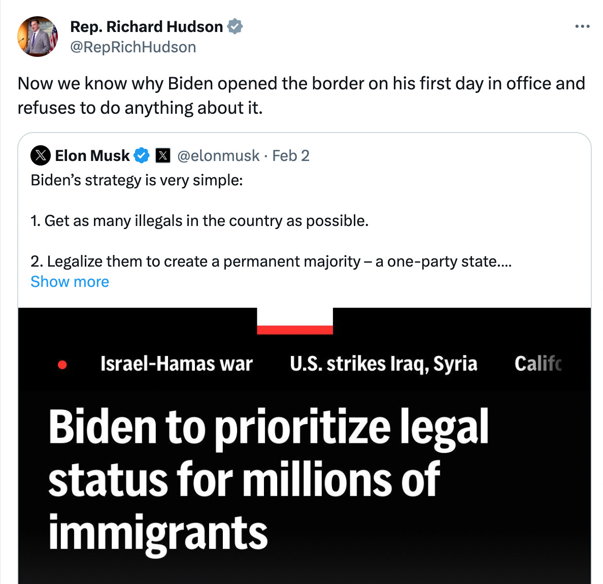 Today, leading Republicans are unapologetically promoting the great replacement theory. On February 3, Congressman Richard Hudson (R-NC) quoted a post on X by Elon Musk. The original post by Musk was a screenshot of an AP article with the headline, "Biden to prioritize legal status for millions of immigrants." Although Musk didn't mention it, this was actually an article from January 16, 2021. It discusses Biden's support for a path to citizenship for Dreamers — undocumented immigrants brought to the country as children — and other immigrants. Musk said the 2021 article was proof that Biden's plan was to "get as many illegals in the country as possible" and then "legalize them to create a permanent majority – a one-party state." Hudson endorsed this theory, adding that "[n]ow we know why Biden opened the border on his first day in office and refuses to do anything about it."