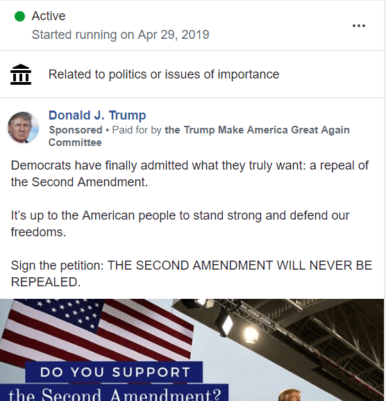 On Monday, I identified dozens of new Trump campaign ads that violated Facebook policies. They were all variants of this ad about the Second Amendment:
