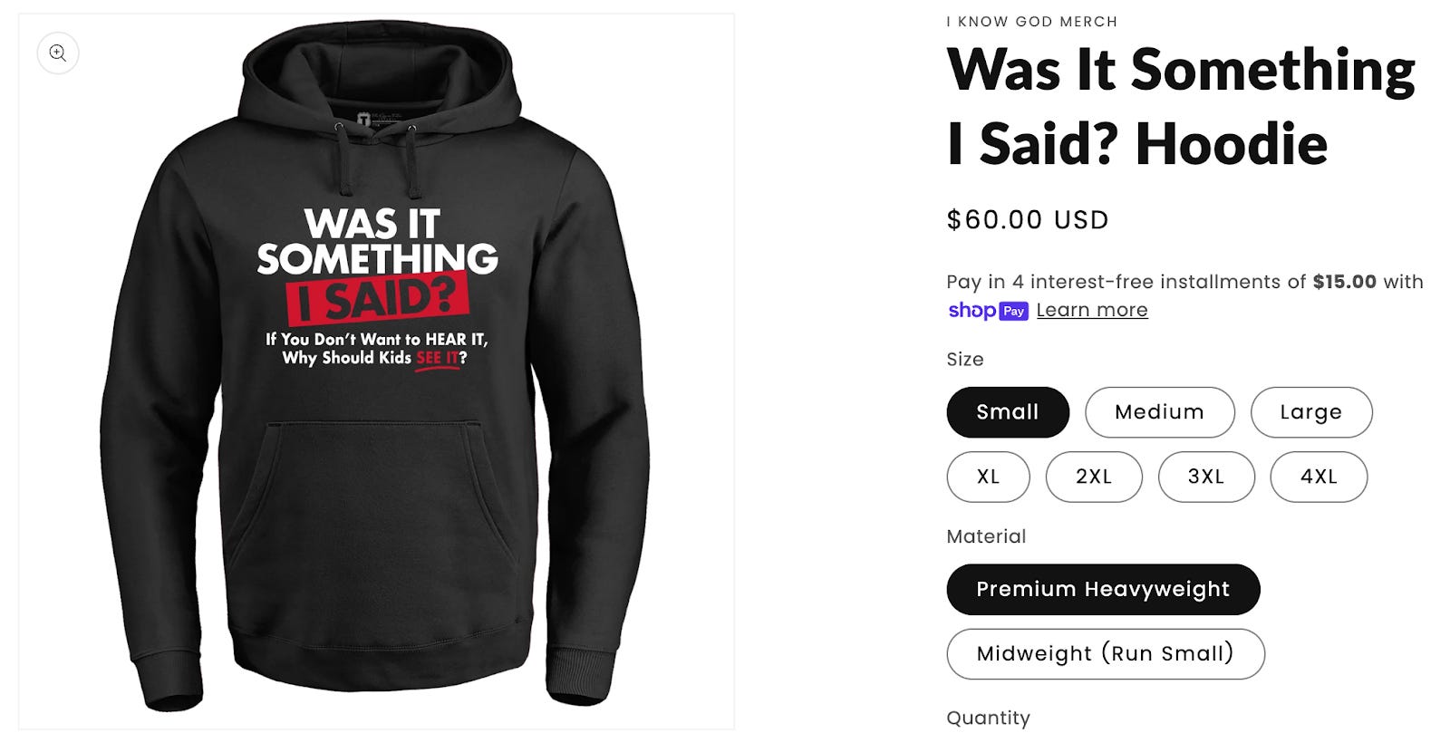 At many school board meetings, Amanchukwu appears wearing hoodies emblazoned with his quotes from past meetings. These hoodies are available for purchase on his website, iknowgodmerch.com, for $60.