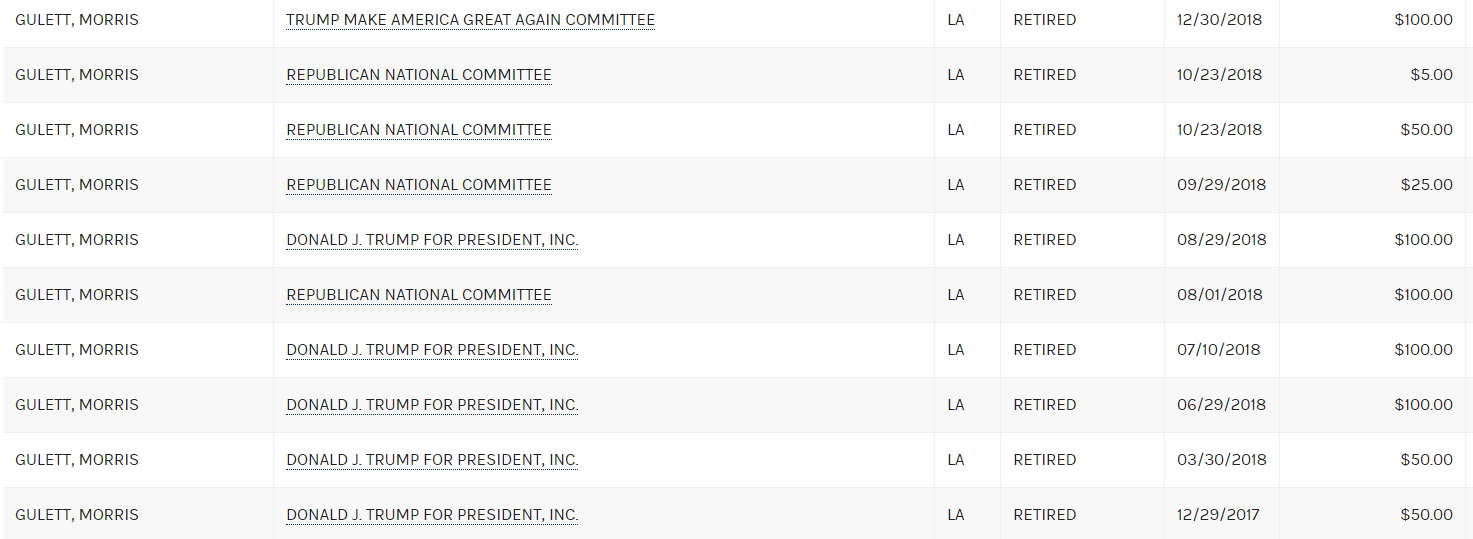 Gulett donated several hundred dollars to Trump and the Republican National Committee and 2017 and 2018.