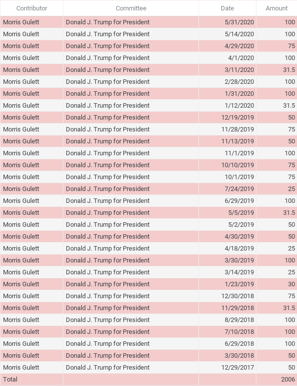 The Trump campaign has accepted at least $2000 from Gulett in 29 separate transactions since December 2017. The most recent contribution from Gulett, according to Federal Election Commission data, was dated May 31, 2020.