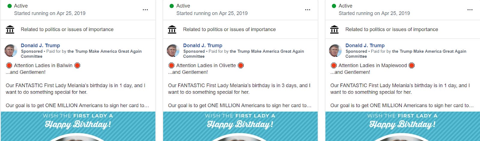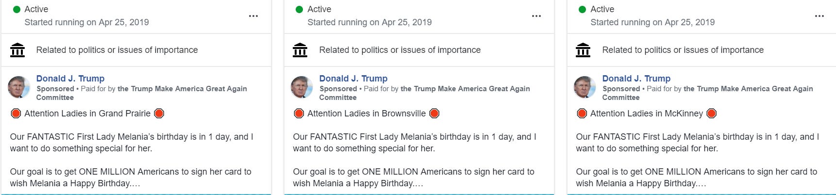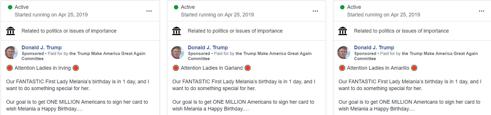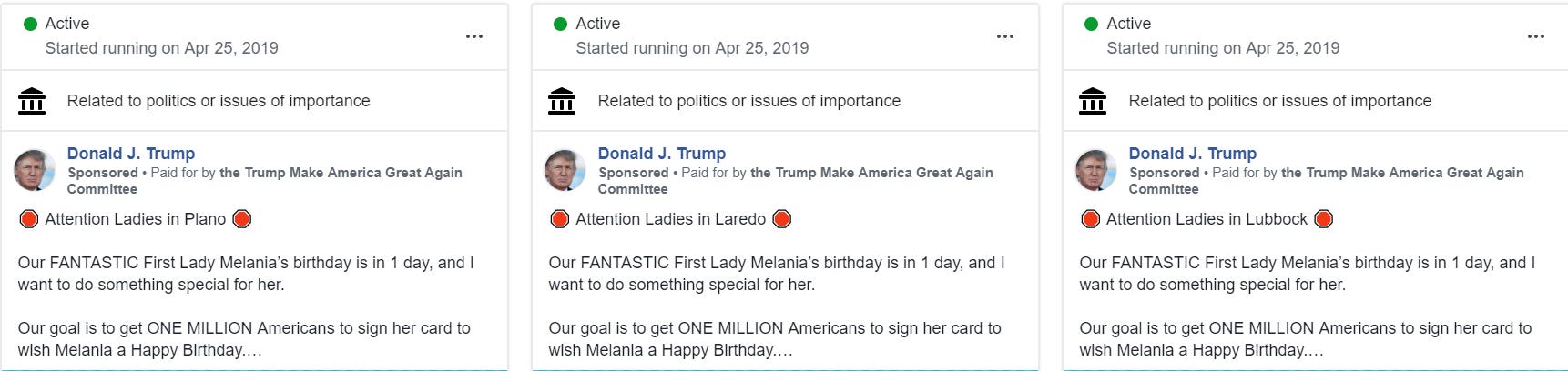 Melania Trump’s birthday is April 26. For weeks, the Trump campaign has used the First Lady’s big day — she’ll be 49 — to build their email list. They’ve run thousands of ads urging Facebook users to sign a “card to wish Melania a Happy Birthday!”