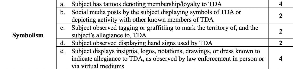 “Under this criteria, LeBron James, who has a crown tattoo and, like many NBA players, dresses in high-end street wear before games, would be "validated" as a member of TDA. (James would be spared deportation to El Salvador because of his American citizenship.)”