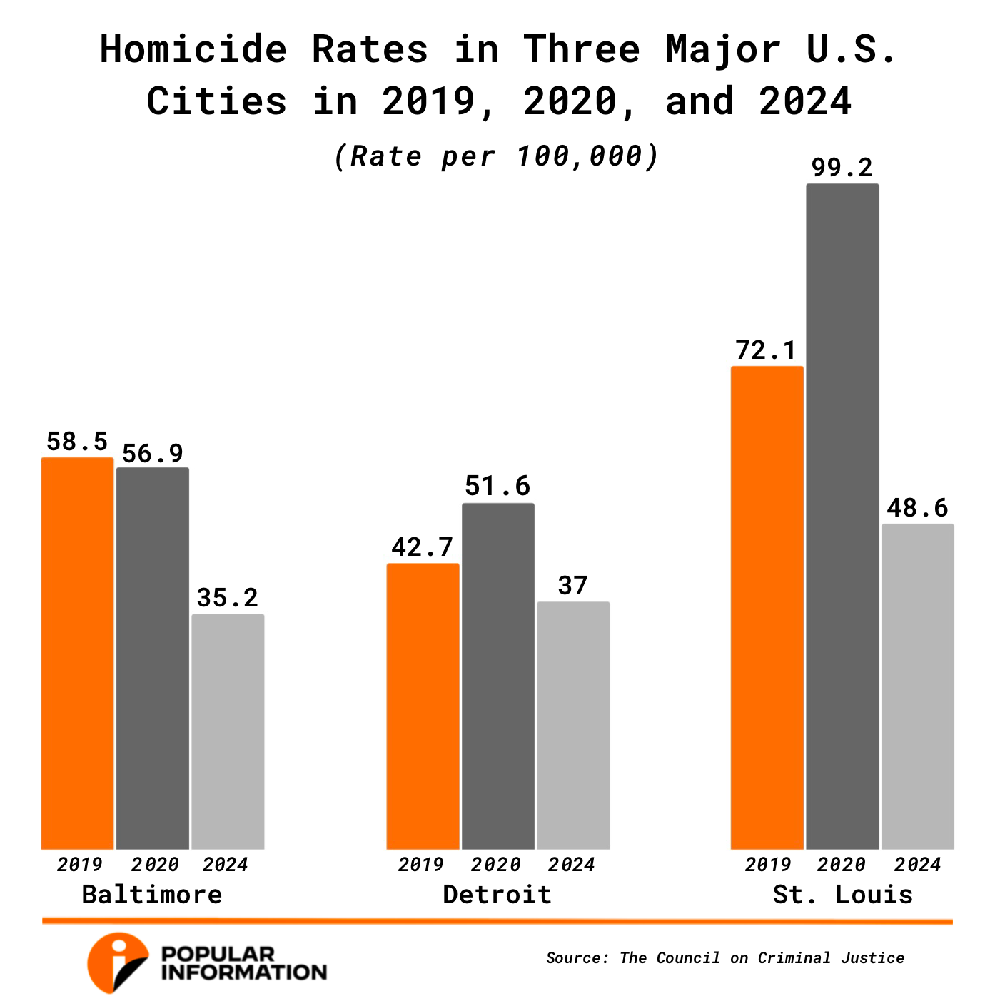 In Detroit and St. Louis, the decline in crime since 2020, the last full year when Trump was in office, is even more dramatic. St. Louis had less than half the number of homicides last year than in 2020.