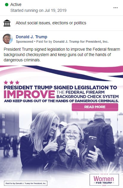 "Women for Trump," however, don't hear about any of this. Instead, they are presented with ads claiming that Trump enacted policies to "improve the federal background check system and keep guns out of the hands of dangerous criminals."