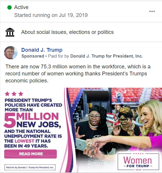 Other Trump Facebook ads targeting women tout the strength of the job market, noting that there are 75.3 million women in the workforce, and unemployment is at an all-time low. This is the strongest argument in his arsenal and something the eventual Democratic nominee will have to address.