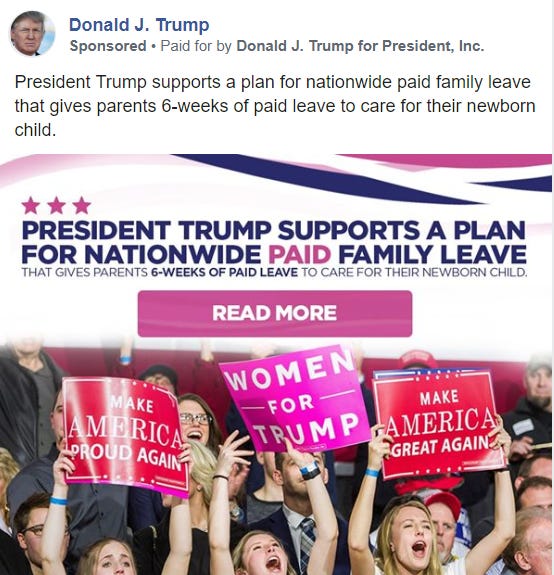 Other Facebook ads targeting women claim that Trump has a "plan" to give new parents "6-weeks of paid leave to care for their newborn child." Sounds great, right?