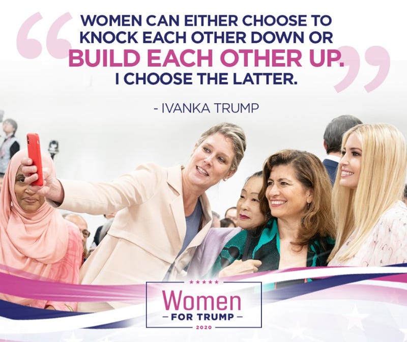 Lara Trump, the president's daughter-in-law and campaign adviser, also encouraged female voters to forget about what Trump says on Twitter and elsewhere. "You don’t have to agree with everything that Donald Trump tweets. You don’t have to agree with the way that he delivers every single message. But you sure as heck are going to like the fact that you have a bit of a better life now thanks to this president," Lara Trump told a crowd at a "Women for Trump" event.