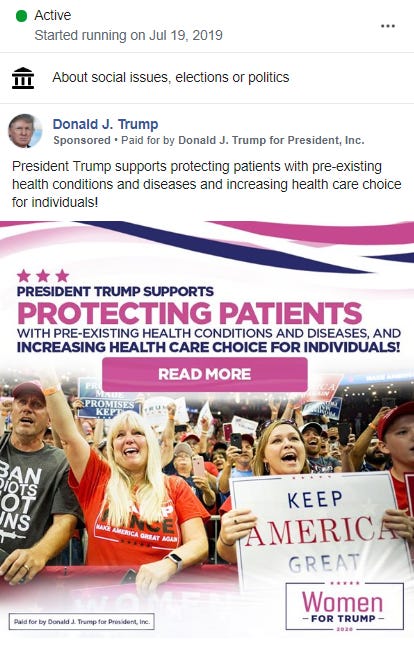 "Women for Trump," however, are told the exact opposite. A Facebook ad claims, "President Trump supports protecting patients with pre-existing conditions."