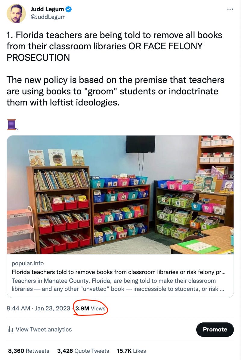 Popular Information's report was based on numerous interviews and social media posts from Manatee County teachers and an interview with Kevin Chapman, the Chief of Staff for the Manatee County School District. We asked Chapman if teachers were being told to "take the books off of the classroom library shelves" until they could be vetted. "That's accurate," Chapman responded.