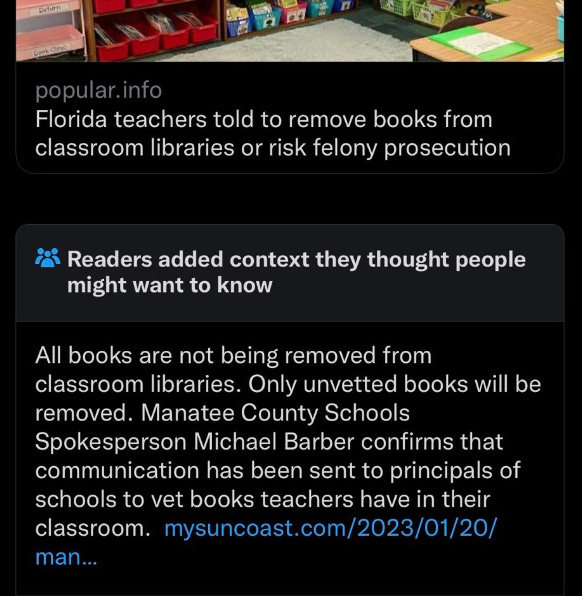 The purpose of a Community Note, according to Twitter, is to "add context to potentially misleading Tweets." The biggest problem with this Community Note is that it is wrong. Teachers in Manatee County have been told to remove all books from their classroom libraries. On Monday, for example, teachers at Bayshore High School in Manatee County received the following message: "Remove or cover all classroom libraries until all materials can be reviewed."