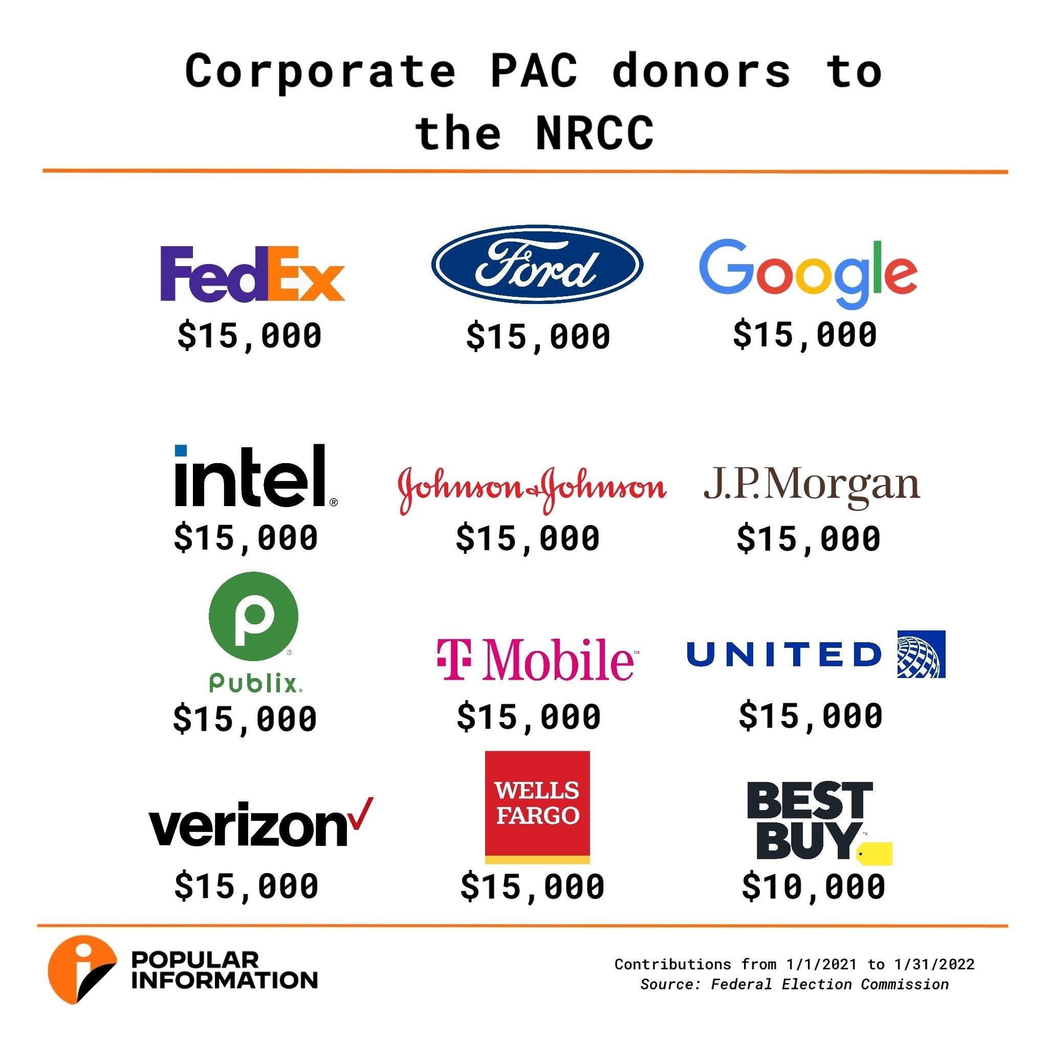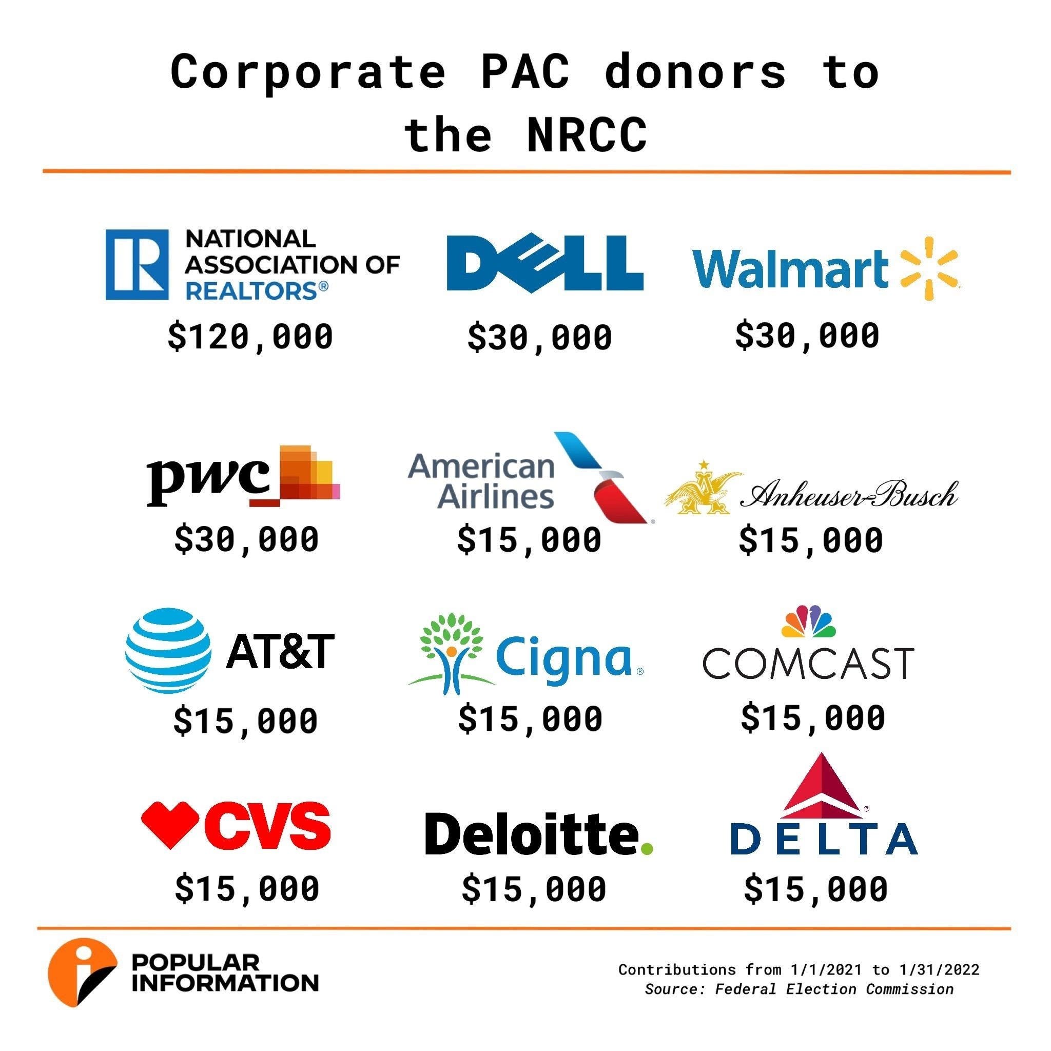 The NRCC provides financial, strategic, and organizational support to its endorsed candidates. This support is made possible by the NRCC's donors. Popular Information contacted 48 corporate PAC donors to the NRCC since 2021. A spokesperson for Liberty Mutual, which donated $15,000 to the NRCC in June 2021, offered this response: