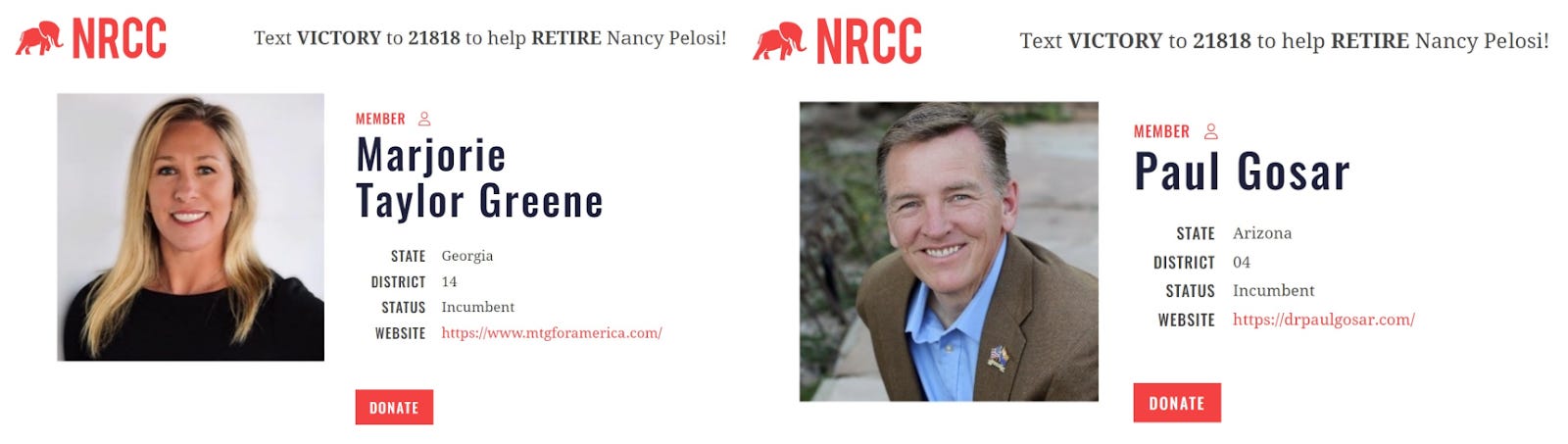 None of this has had any impact on the NRCC, which is actively supporting Gosar and Greene. Both have pages on the NRCC website along with a prominent button to donate to their reelection campaigns.