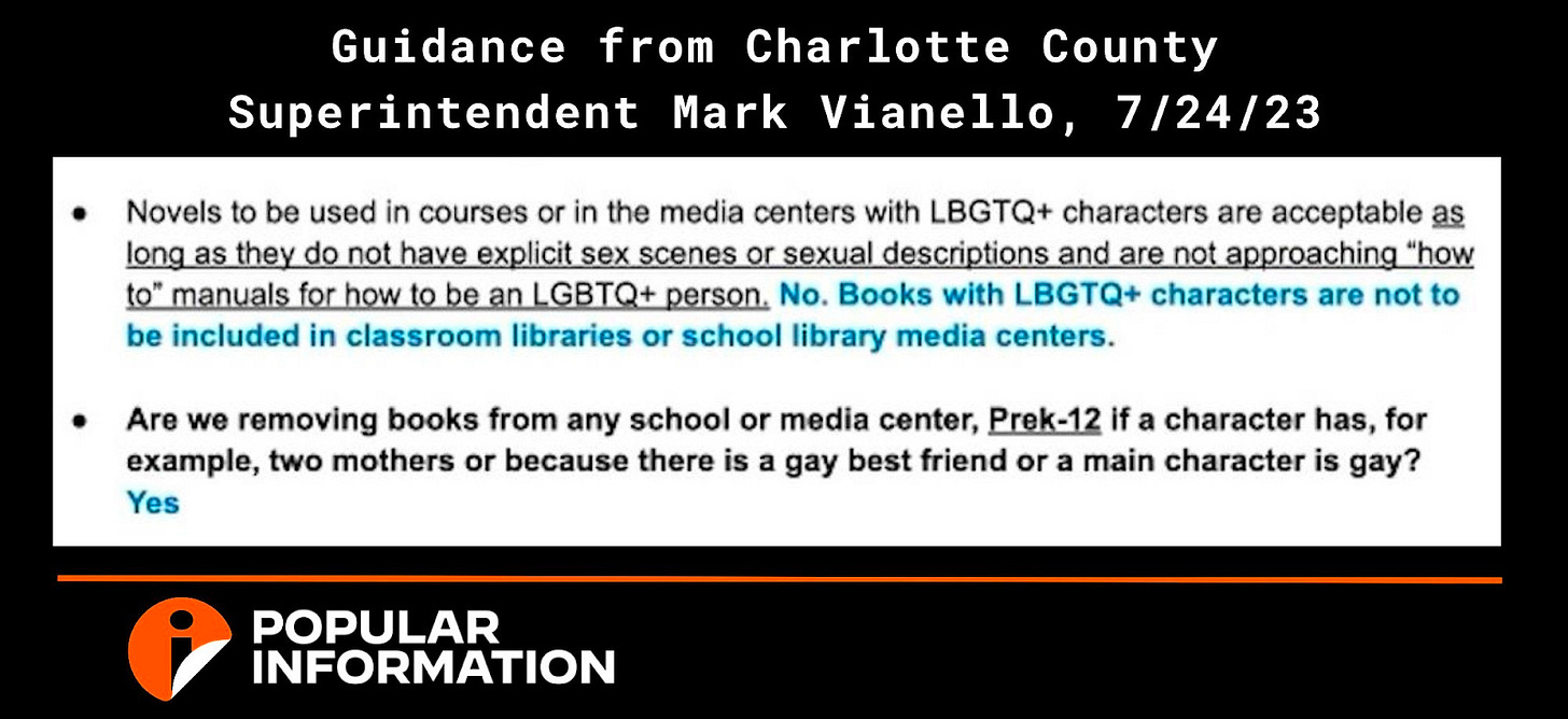 On September 26, Popular Information reported that librarians in Charlotte County, Florida, public schools were instructed to remove books with LGBTQ characters from school and classroom libraries. This report was based on the following: