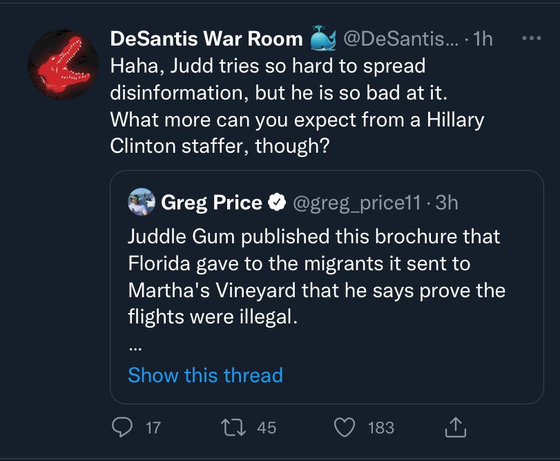 DeSantis' office responded by quickly scheduling a press briefing with sympathetic media outlets, including Florida's Voice and Townhall. In the briefing, Taryn Fenske, communications director for the governor, confirmed Popular Information's reporting. Specifically, she said that the brochures were provided to migrants by DeSantis' operation to help convince them to travel to Massachusetts.