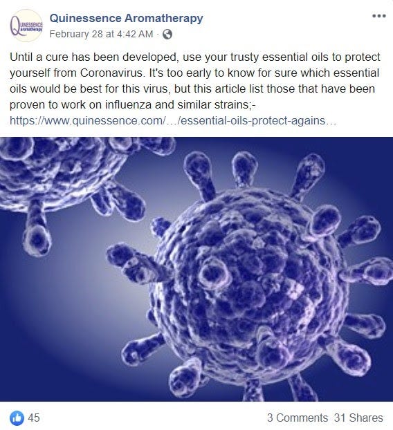 Quinessence Aromatherapy, for example, had a page on its website titled "Essential Oils to Protect Against Coronavirus."