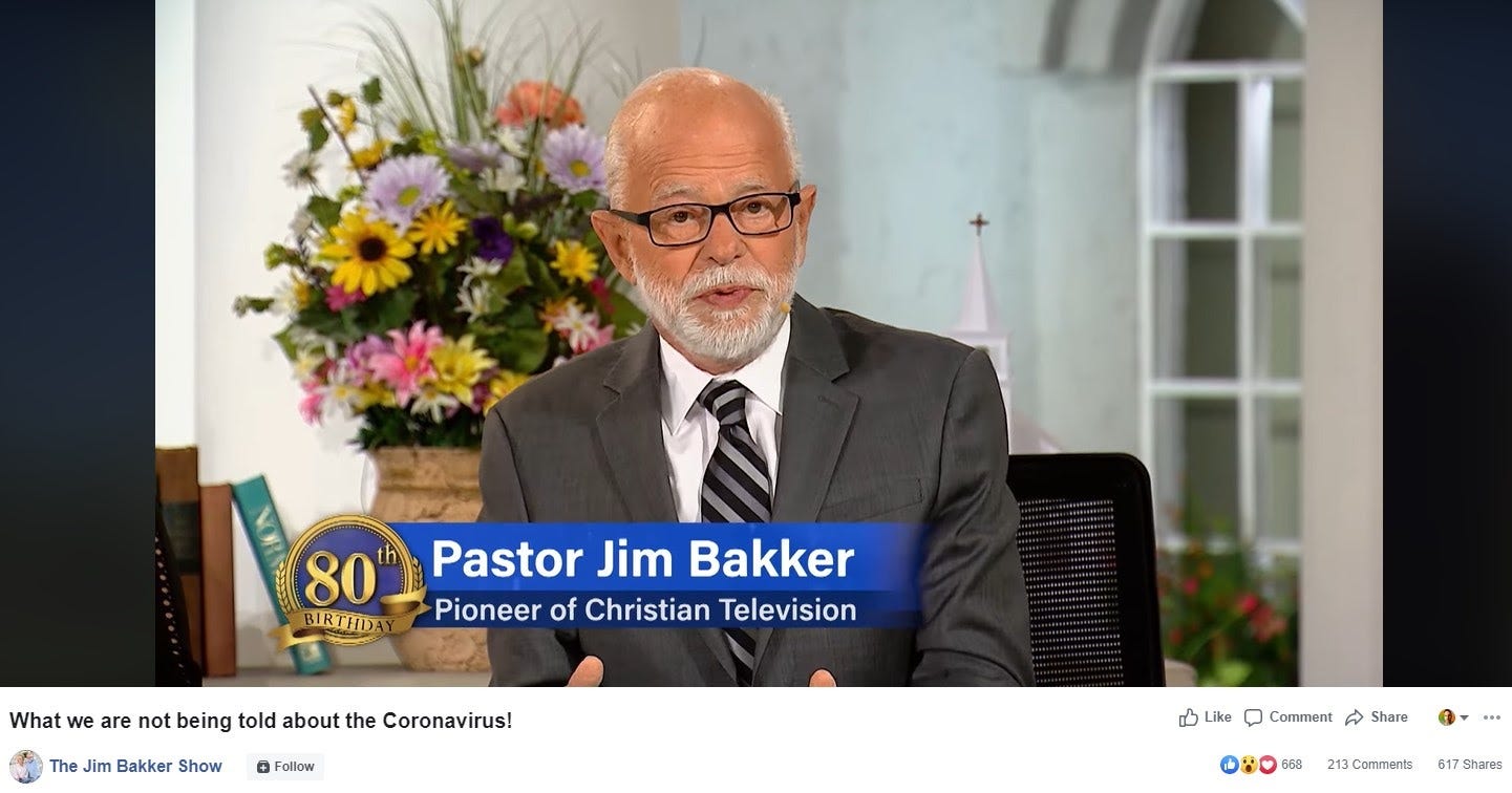 Another company cited by the FDA and the FTC was The Jim Bakker Show, a program hosted by televangelist and convicted fraudster Jim Bakker. He served four years in jail for fraud in the 1990s. His show is selling "Silver Sol Liquid," which a guest on Bakker's show claimed has been "tested on other strains of the coronavirus" and "within 12 hours, totally eliminate it, kills it, deactivates it."