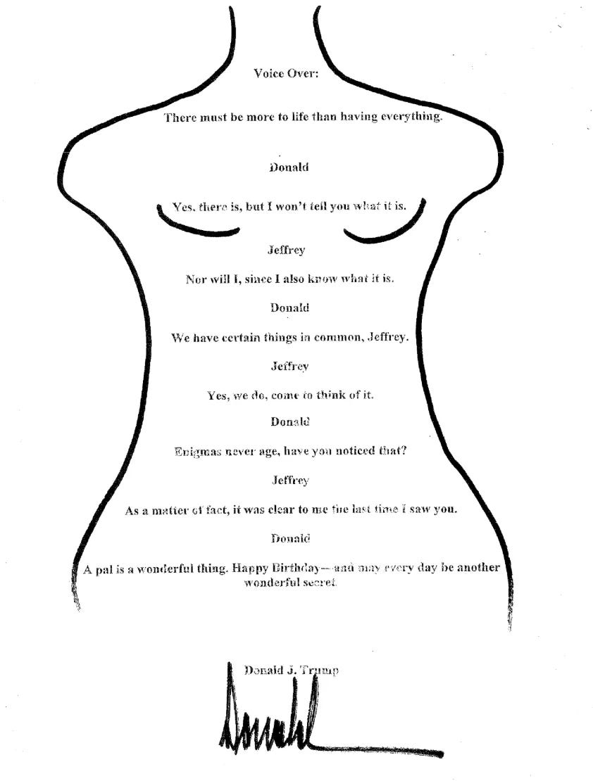 The alleged letter, as reported by the Wall Street Journal, is structured as an imagined dialogue between Trump and Epstein. “We have certain things in common, Jeffrey,” Trump says. “Enigmas never age, have you noticed that?” The letter concludes: “A pal is a wonderful thing. Happy Birthday — and may every day be another wonderful secret.”