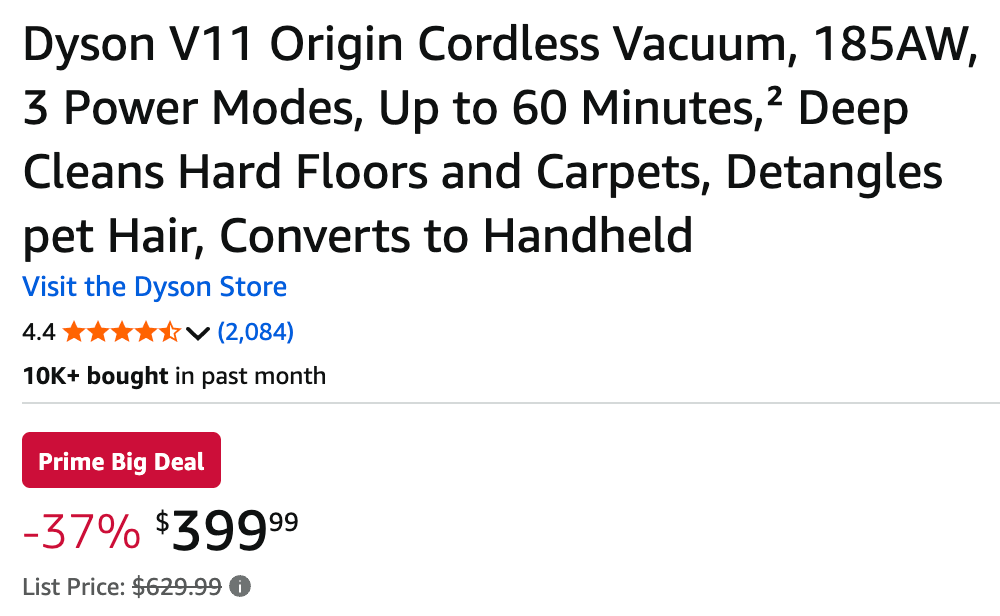 The deals offered during this sale are similarly dubious. For example, a Dyson cordless vacuum is being advertised as 37% off its list price of $629.99. But the vacuum had never been sold on Amazon for $629.99 until September. It’s available on Amazon nearly every month for less than $500. Over the Christmas and New Year’s holidays last year, the same vacuum was available on Amazon for $349.99.