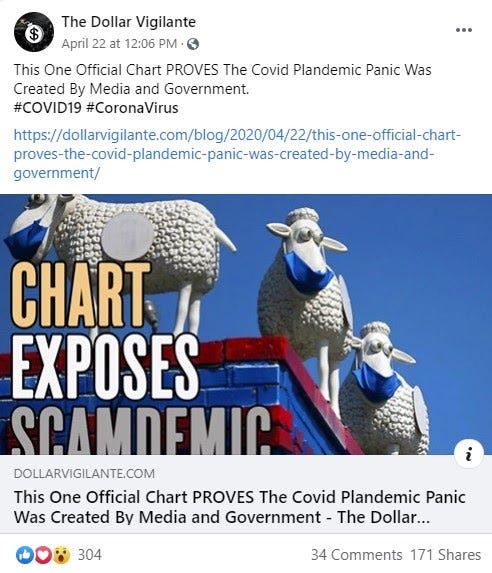 Another Facebook page, The Dollar Vigilante, has over 136,000 followers. An April 22 Facebook post, which has been shared 171 times, promises proof that the "Covid Plandemic Panic Was Created By Media and Government."