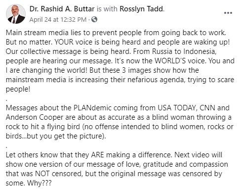 In a rambling April 24 Facebook post, Buttar asserted that "Messages about the PLANdemic coming from USA TODAY, CNN and Anderson Cooper are about as accurate as a blind woman throwing a rock to hit a flying bird." These media reports, Buttar said, contain "lies to prevent people from going back to work." The post also promoted an upcoming appearance on InfoWars, a conspiracy website that also claims the coronavirus is a hoax engineered by the elite. The post was shared more than 1700 times.