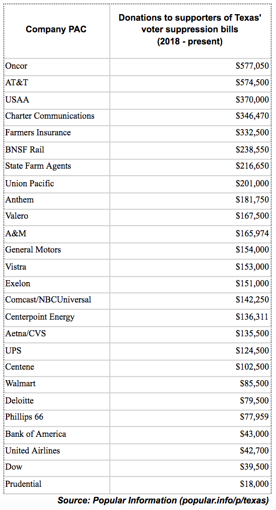 For months, members of the Texas legislature have been considering two bills (SB7 and HB6) that would make it harder to vote — particularly in areas with large Black populations like Harris County. In March, Popular Information reported that the sponsors of these bills are backed with millions from corporate PACs. But, with a couple of prominent exceptions, corporations remained silent.