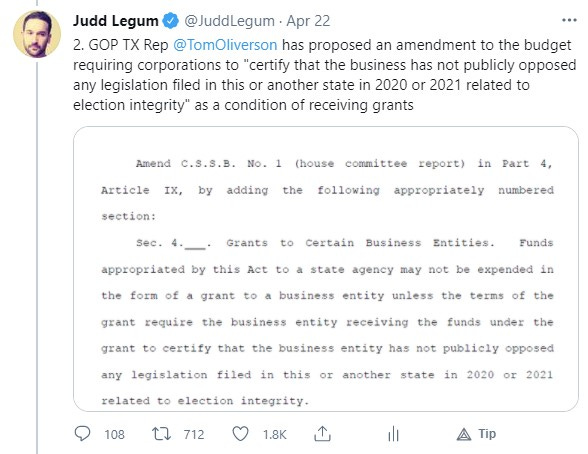 Republican legislators have made threats publicly and privately against any corporation that speaks out against legislation to restrict voting. In late-April, Republicans introduced several amendments to the budget which would withhold funds from corporations that publicly oppose voter suppression. Texas Representative Tom Oliverson (R) introduced legislation that would withhold certain government funds from any corporation that "publicly opposed any legislation filed in this or another state in 2020 or 2021 related to election integrity."