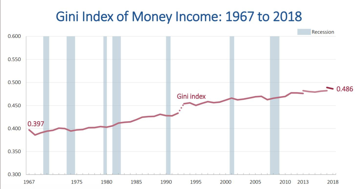 The economy has been growing, but most of the benefits have been flowing to the very top. The Gini Index, a statistical measure of inequality, has reached an all-time high since the Census started measuring it in 1967.
