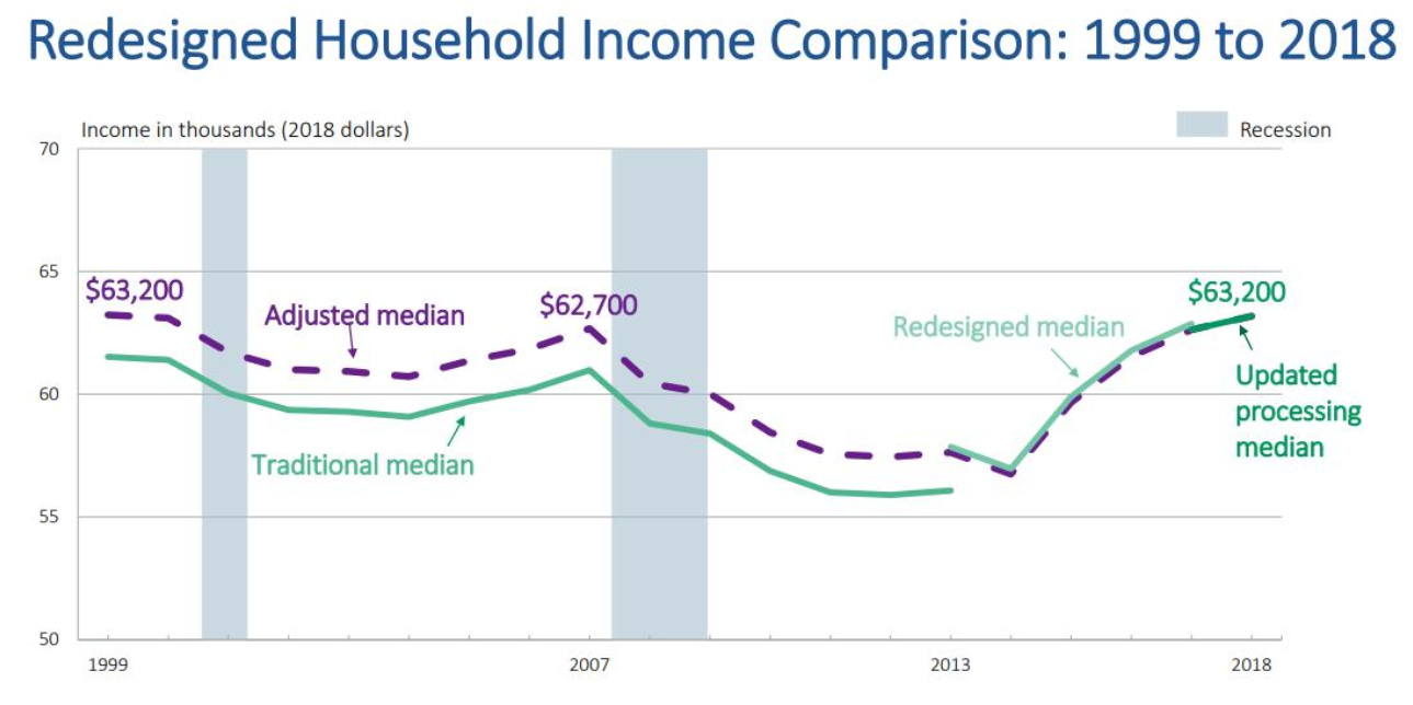 That hasn't happened. The Census Bureau reports "[m]edian household income was $63,179 in 2018, not statistically different from the 2017 median, following three consecutive years of annual increases." In other words, median income was growing somewhat and, after the passage of Trump's tax cuts, it stopped.
