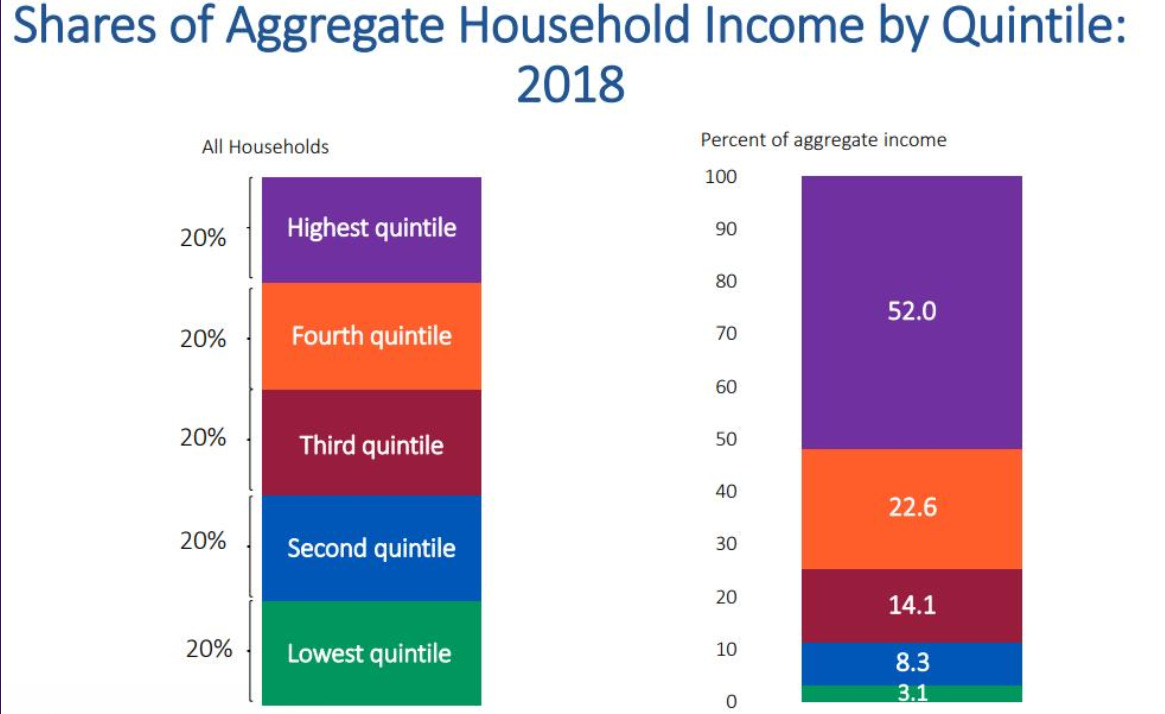 The top 20% of Americans collected 52% of total household income last year. Meanwhile, the bottom 20% received just 3.1%.