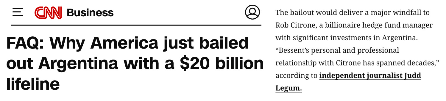 This reporting has changed the narrative about the motivations behind the U.S. bailout of Argentina. Previously, media outlets attributed it solely to the ideological alignment of Trump and Milei. Now, CNN is noting how Citrone would benefit in its FAQ about the issue: