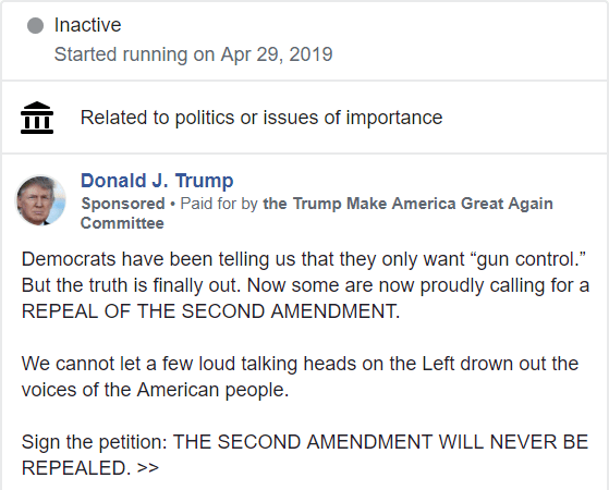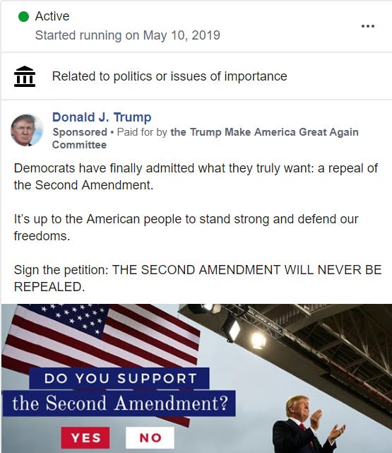 On April 29, Popular Information identified hundreds of Trump campaign ads running on Facebook that were false. The ads claimed that Democrats want to repeal the Second Amendment.