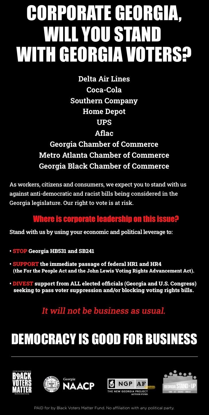 A few hours later, a coalition of civil rights groups in Georgia announced a new advocacy campaign based on this research. The coalition, which includes the Georgia NAACP, The New Georgia Project, Black Voters Matter, and Stand Up Georgia, is demanding that corporations headquartered in the state publicly oppose these bills and divest from politicians who are sponsoring them. On Thursday, the group began running ads in newspapers across the state that specifically target Delta, Coca-Cola, Southern Company, UPS, and Aflac.