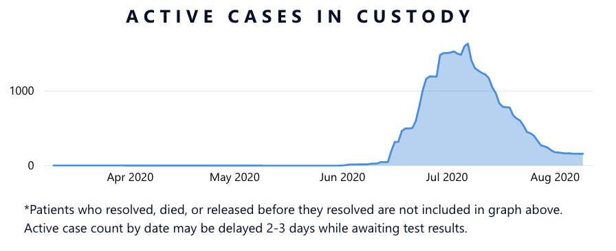 While cases at San Quentin have declined, CDCR data shows that there have been 1,159 new confirmed cases in California prisons in the last two weeks. Five prisons reported more than 100 new cases. One prison, CA Correctional Institution, reported 211 new cases over the past 14 days. Other facilities nationwide are also suffering a surge in cases. According to a tracker maintained by The Marshall Project, there were at least 3,808 new cases in Florida and 1,427 in Texas reported among prisoners the week of August 11.