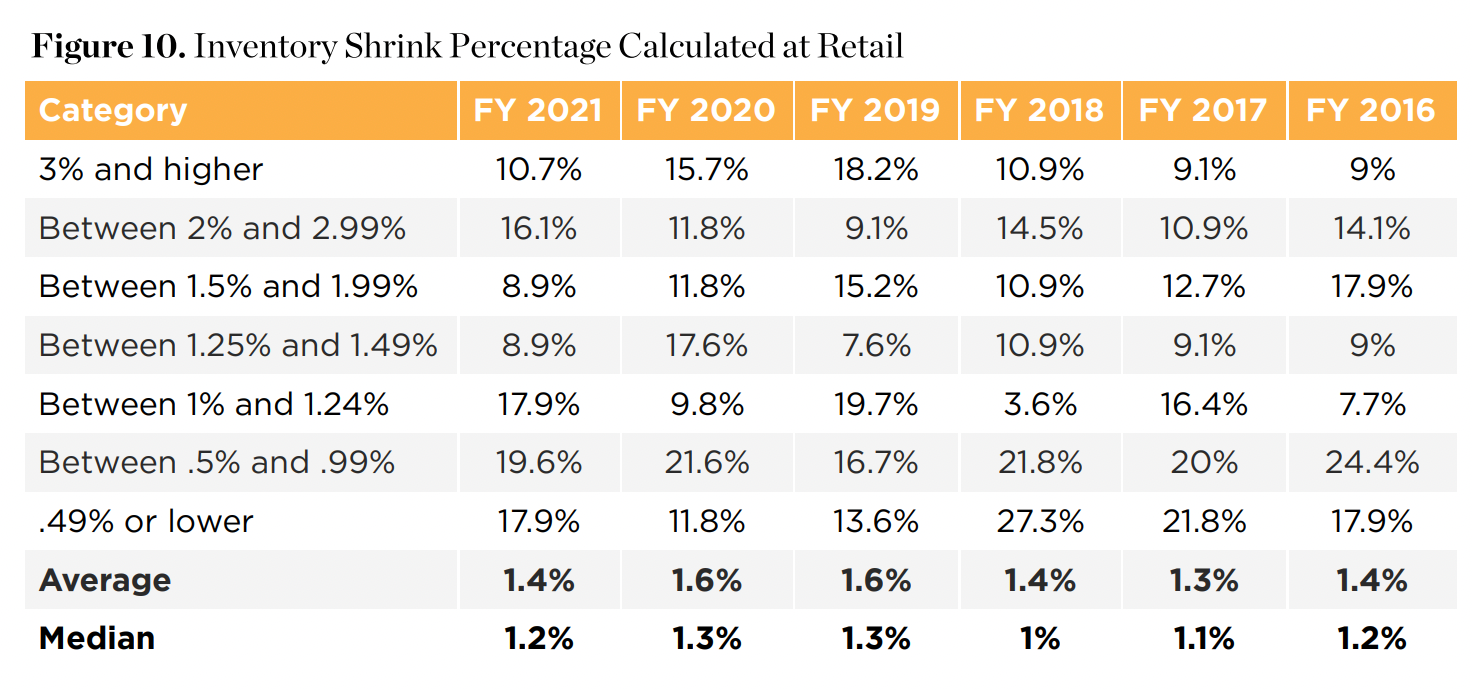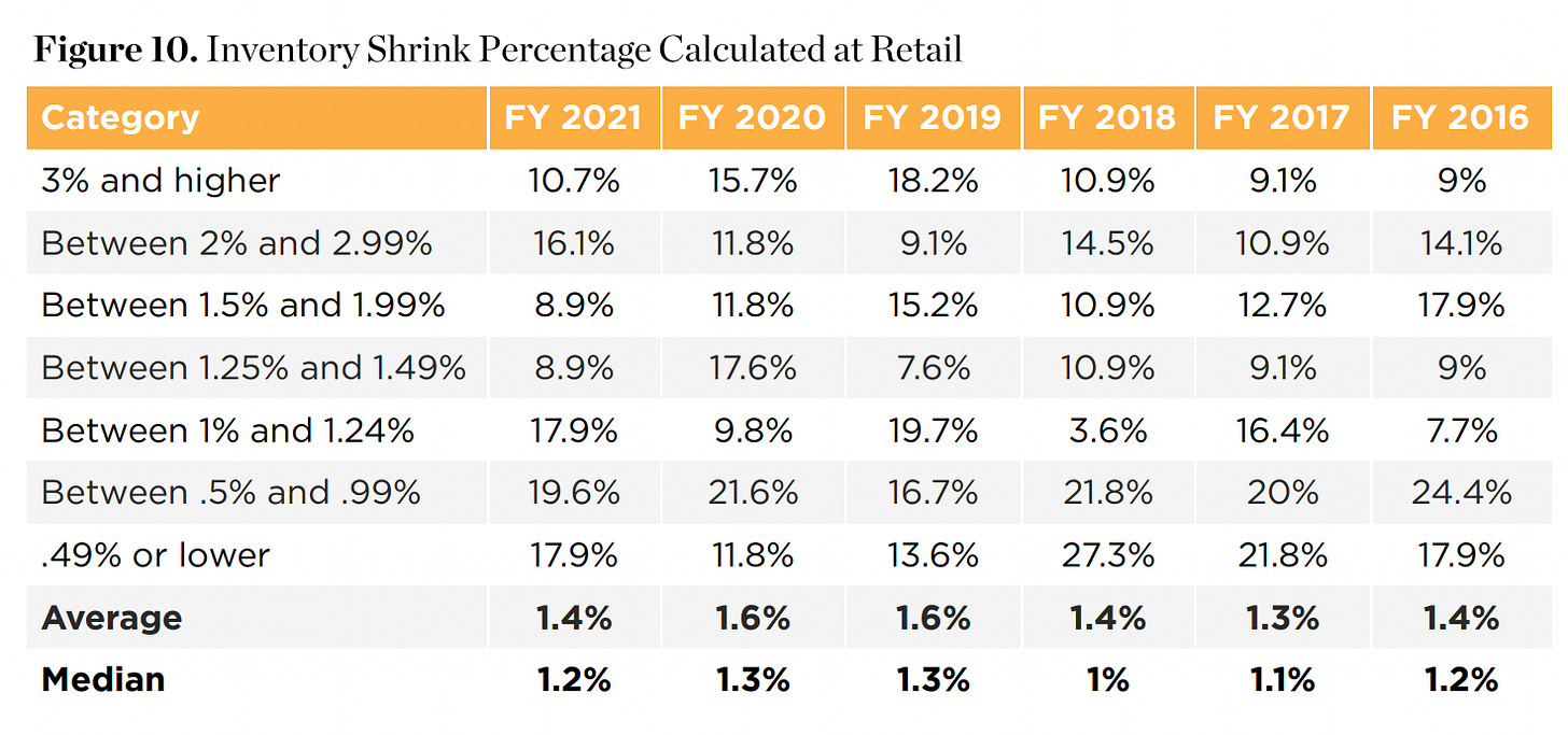 Of course, not all shoplifting incidents result in charges. But the National Retail Federation, a trade association that represents Walmart and other major retailers, found that "shrink" — an industry term for inventory losses from theft, damage, or administrative errors — declined between 2019 and 2021. In 2021, the average shrink rate was 1.4% of total retail sales. That means for every $100 in sales, an average of $1.40 in inventory was lost. Retail theft alone amounted to 0.5% of total retail sales, or $0.52 for every $100.