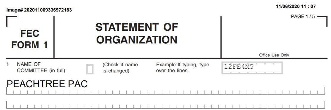 Peachtree PAC, which has emerged as one of the largest spenders in Georgia's runoffs, filed its "Statement of Organization" with the Federal Election Commission (FEC) on November 6, shortly after the general election.